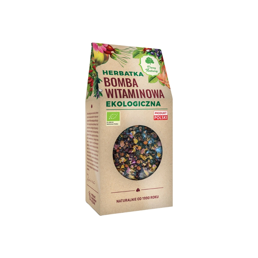 | Składniki | róża owoc* 22%, jabłko owoc* 10%, tarnina owoc*, berberys owoc*, bez czarny owoc*, jarzębina owoc*, porzeczka czarna owoc*, głóg owoc*, hibiskus kwiat*, malina owoc*, borówka wysoka owoc*, róża płatki* *produkt rolnictwa ekologicznego |