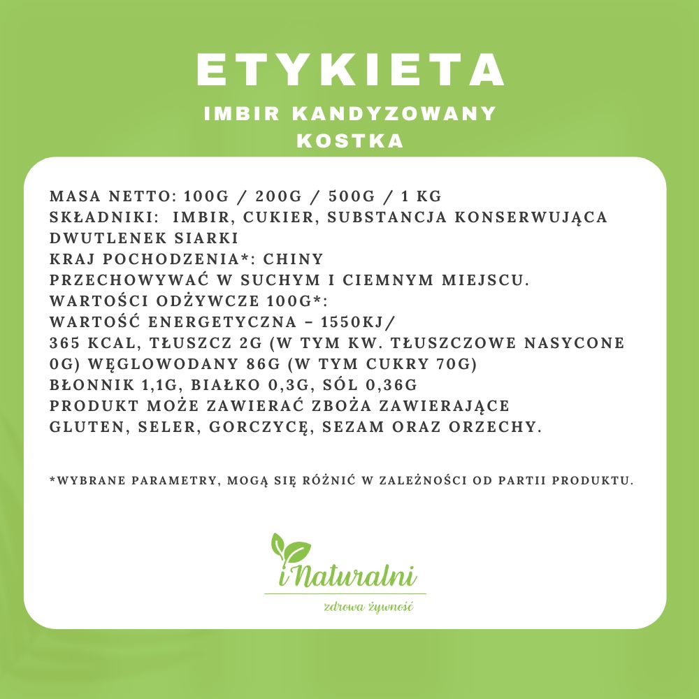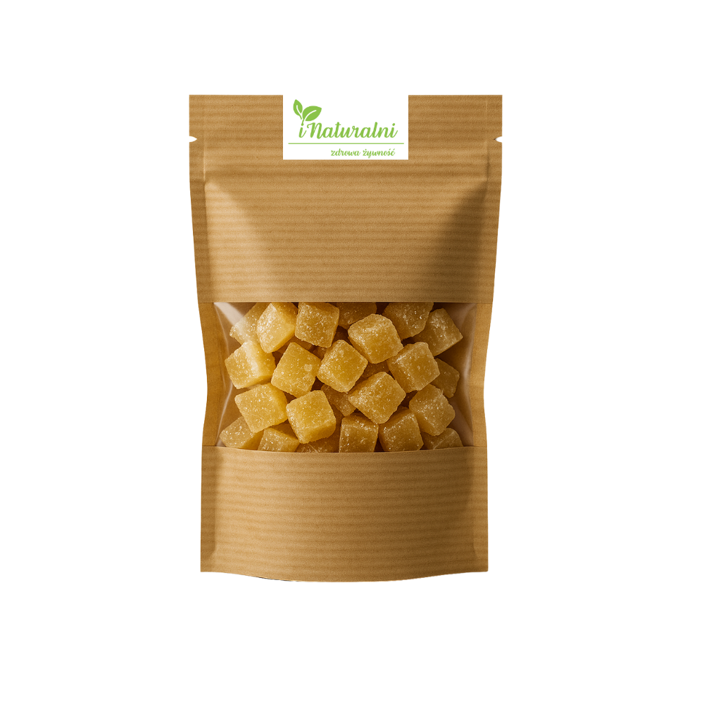 Kandyzowany imbir w kostkach to doskonała przekąska, która łączy słodycz z korzystnymi właściwościami imbiru. Jest nie tylko smaczny, ale również pomaga w łagodzeniu niestrawności i nudności, a także wspiera odporność, dzięki swoim naturalnym właściwościom przeciwzapalnym i przeciwbólowym.