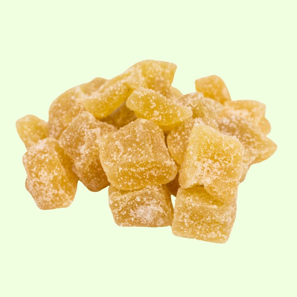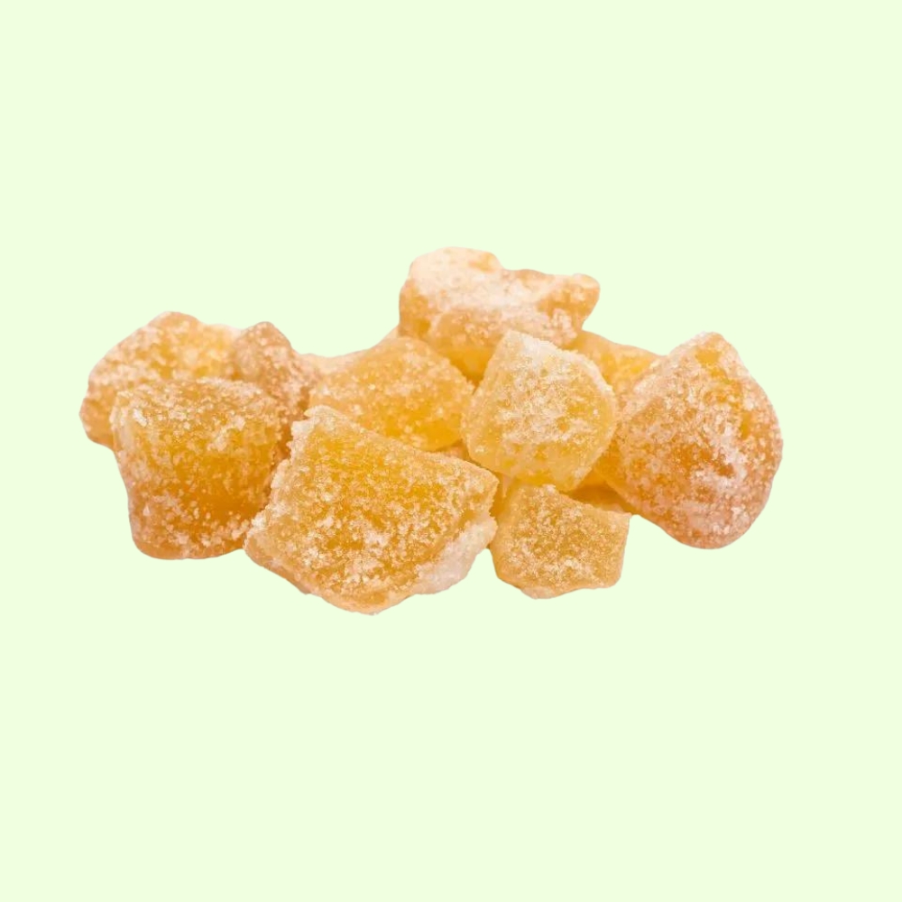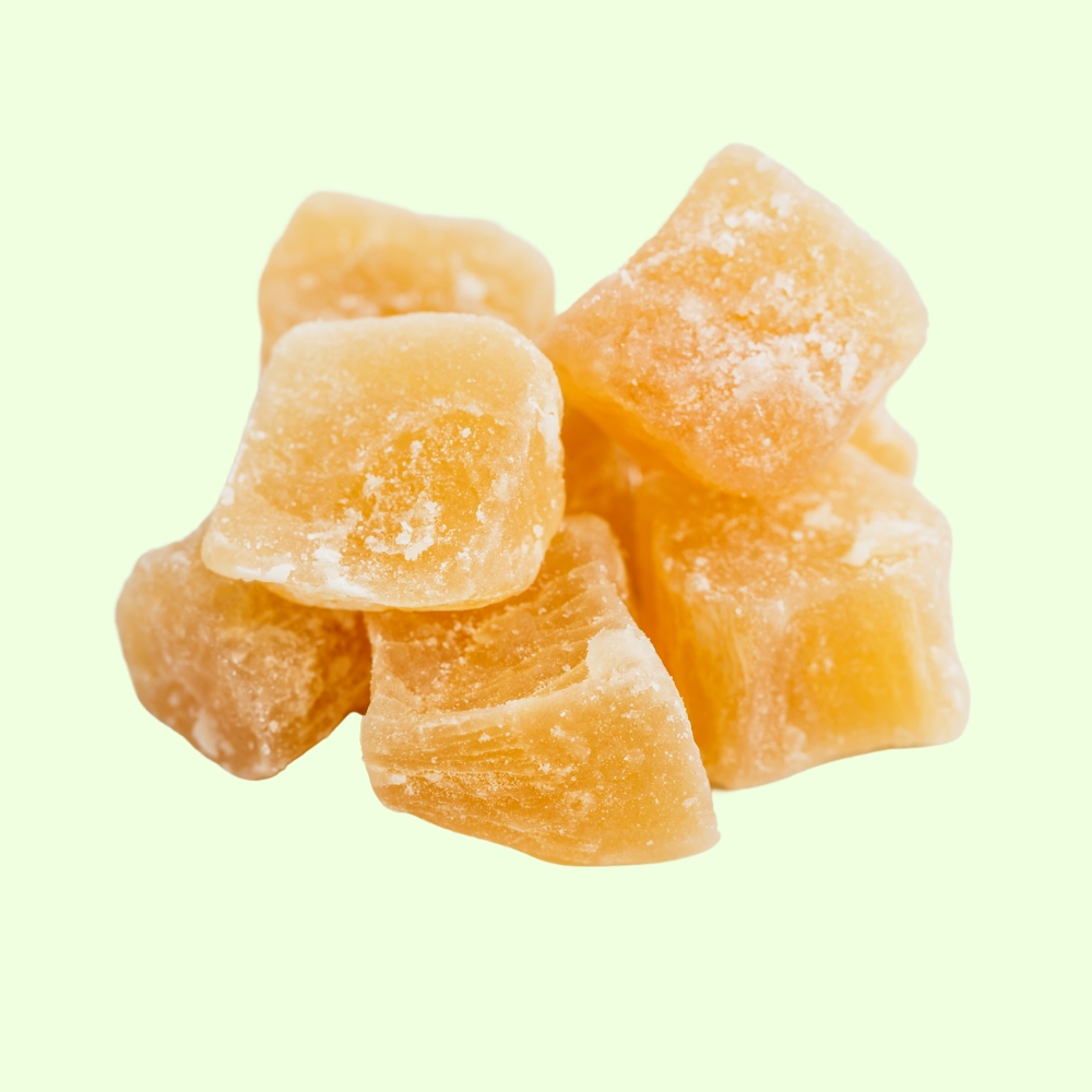 ✔️Łagodzenie niestrawności: Imbir jest znany ze swoich właściwości wspomagających trawienie. Kandyzowany imbir może pomóc łagodzić objawy niestrawności, takie jak wzdęcia czy uczucie pełności, a także wspierać prawidłową perystaltykę jelit.