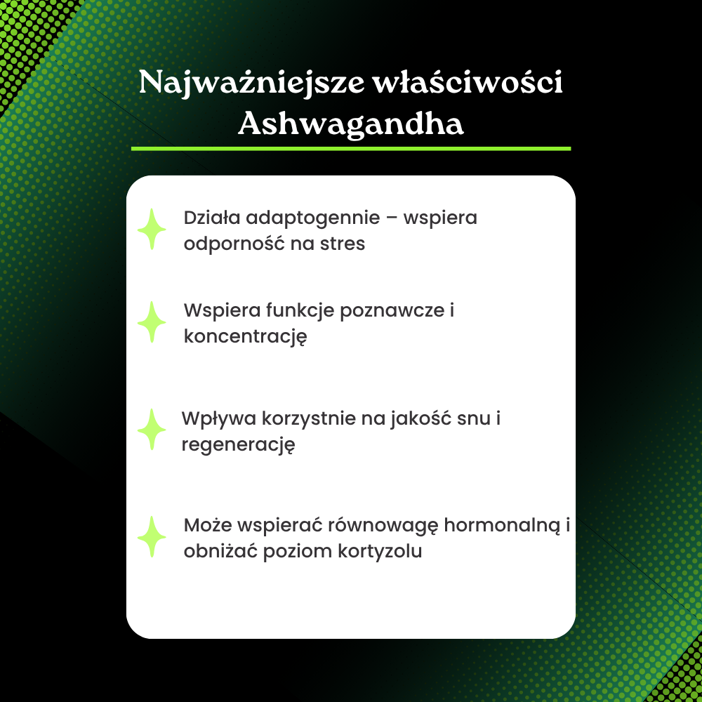Ashwagandha, znana również jako żeń-szeń indyjski, to jedno z najważniejszych ziół stosowanych w tradycyjnej ajurwedzie. Należy do grupy adaptogenów – naturalnych substancji wspierających zdolność organizmu do radzenia sobie ze stresem fizycznym i psychicznym. Korzeń ashwagandhy zawiera bioaktywne związki, takie jak witanolidy, którym przypisuje się korzystny wpływ na układ nerwowy, równowagę emocjonalną i ogólne samopoczucie. Suplementacja ashwagandhą może być szczególnie pomocna w stanach napięcia, zmęczenia oraz w okresach wzmożonego obciążenia psychicznego.