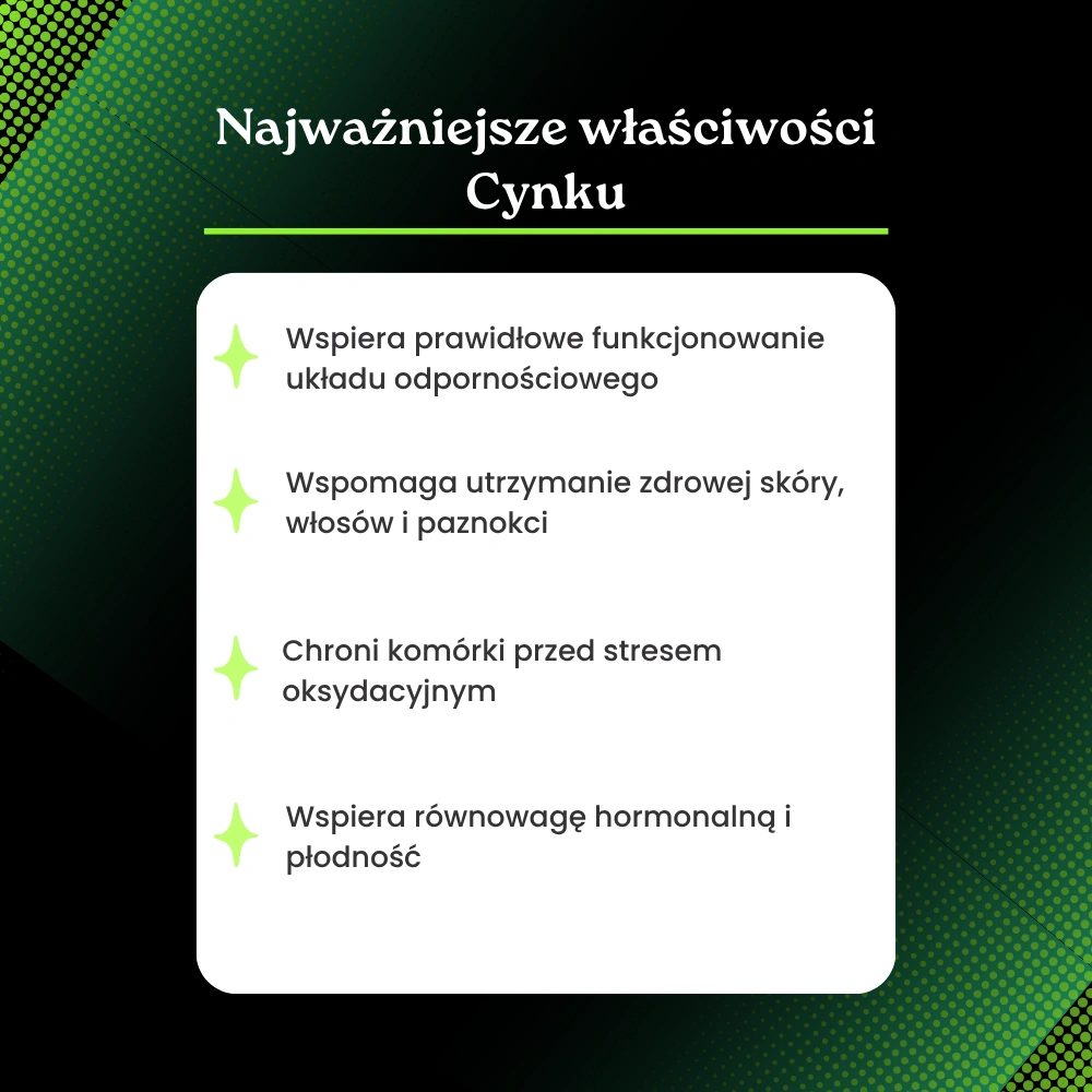 Cynk to niezbędny mikroelement, który odgrywa kluczową rolę w licznych procesach biologicznych organizmu. Wspomaga prawidłowe funkcjonowanie układu odpornościowego, wspiera syntezę DNA i białek oraz chroni komórki przed stresem oksydacyjnym. Ma również duże znaczenie dla utrzymania zdrowej skóry, włosów i paznokci oraz prawidłowego poziomu testosteronu i funkcji rozrodczych. Ze względu na ograniczoną możliwość magazynowania cynku przez organizm, jego regularne dostarczanie z dietą lub suplementacją jest niezbędne – szczególnie w okresach wzmożonego wysiłku, stresu, aktywności fizycznej oraz przy osłabionej odporności.