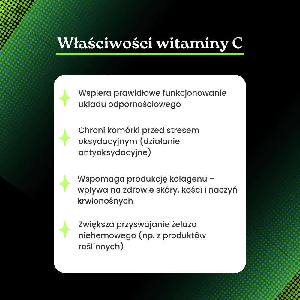 Witamina C to popularny składnik diety osób aktywnych fizycznie. Bierze udział w wielu procesach zachodzących w organizmie, w tym w produkcji kolagenu – białka stanowiącego ważny element budulcowy naczyń krwionośnych, kości, chrząstki, dziąseł, zębów i skóry. Dodatkowo odgrywa rolę w metabolizmie energetycznym oraz pracy układu nerwowego. Kwas L-askorbinowy jest także znany ze swoich właściwości antyoksydacyjnych i wpływu na ochronę komórek przed stresem oksydacyjnym
